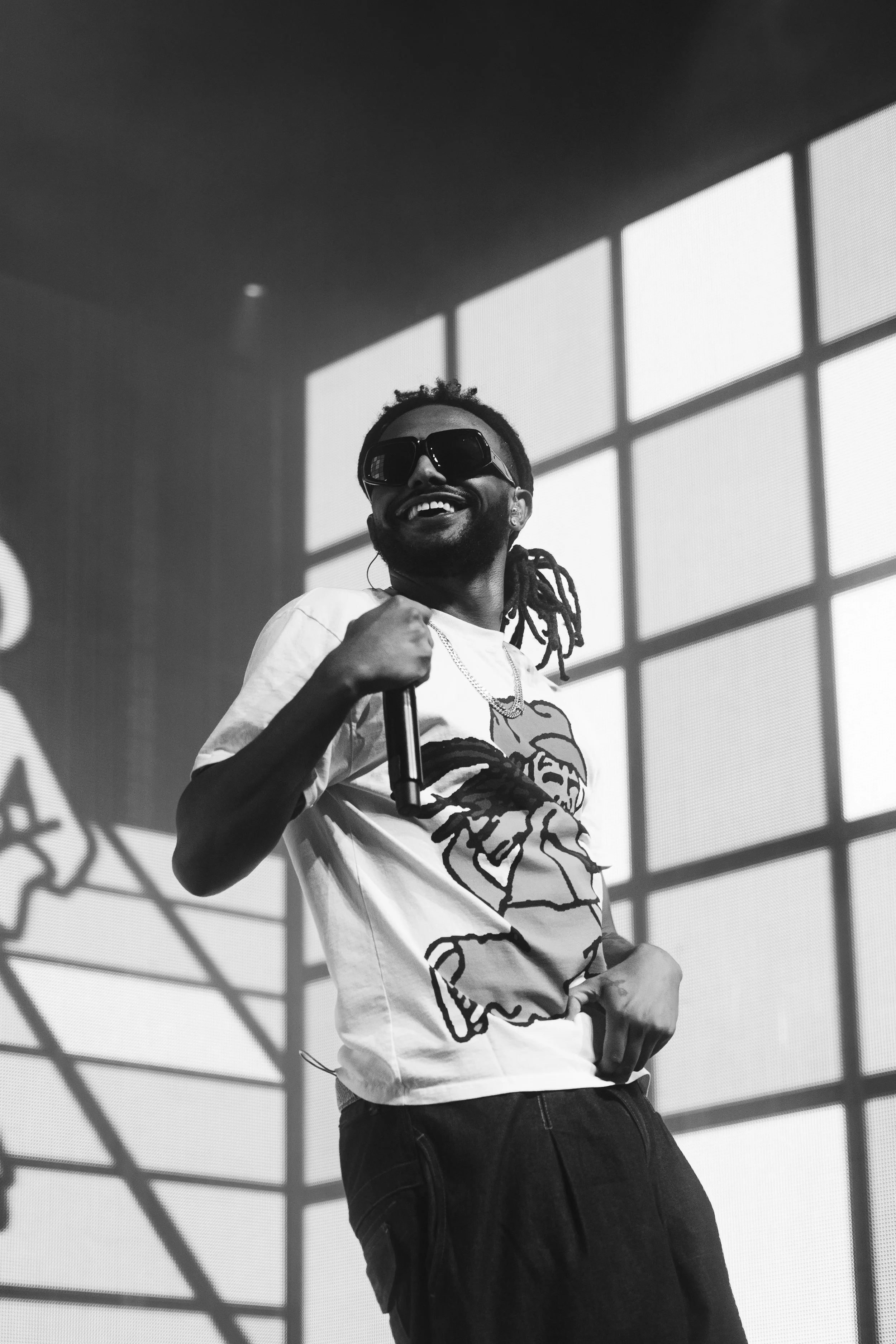 Person performing on stage holding a microphone, wearing a white graphic t-shirt and a bracelet.